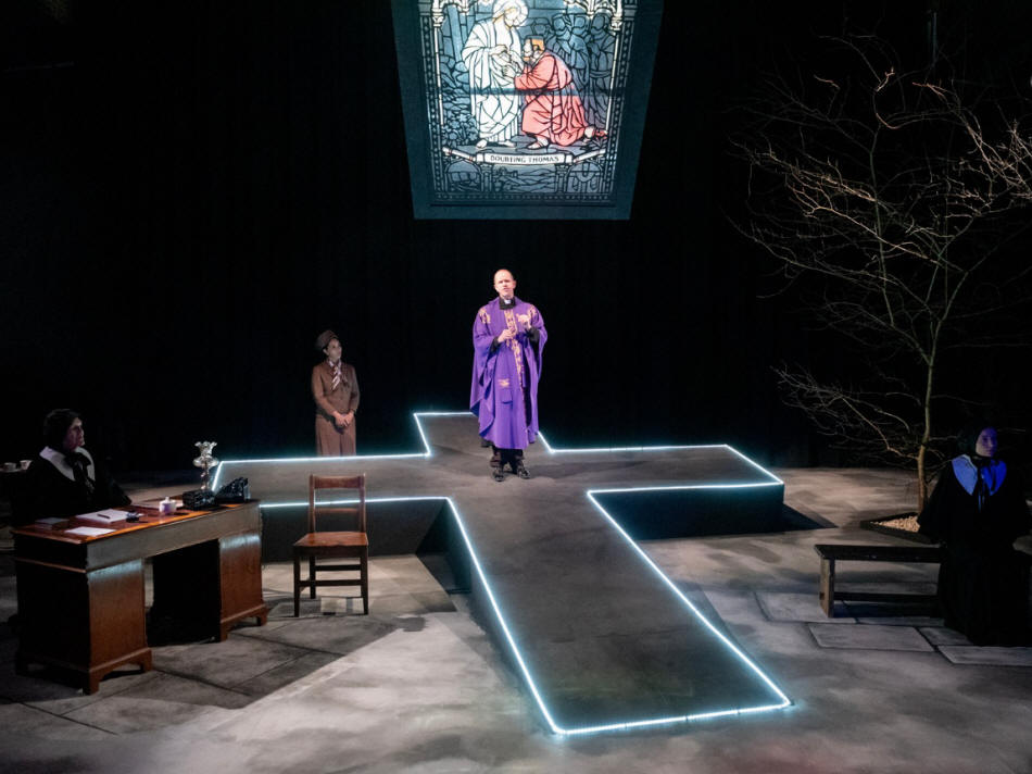 But more on the performance; the story being essentially just that. The massive brightly lit cross which dominates the stage (Richard Moore) with a wonderfully atmospheric stained glass window drives home the essential fact that what is possibly being abused here is not what is claimed, but religion itself – here Catholic. The moves in Chris Gilbey-Smith’s production are actually rather limited because of this, which limits. Its most striking and effective moment is actually at the close, when Sue Moore, suddenly spiritually troubled and, one feels, wonderfully stirred internally, indicates she has – yes – doubt. She has made the uncharacteristic, occasional allowance, previously (‘but maybe it’s nothing….’). Curiously there’s virtually only one joke in the whole (‘Not that there’s anything wrong with sugar’). Another thing that impressed was the skill Director and cast managed to generate not overstressed or exaggerated American accents, but mild and restrained ones. It suited the production remarkably well, and Father Flynn’s Irish background showed through too. This was strikingly competent, and it worked really well.. It's the scene at the start, between two nuns, that sets the ball rolling so effectively. The shy young nun, Sister James (Anna Butcher), almost a novice, who inadvertently draws attention to the possible issue, is played with such delicacy and respect, purity and touching innocence, she creates the most exquisite of the four performances. Her technique is astonishing – the little flutters of her head, her shoulders, her facial flitters. This was a wonderful performance. There are only two big rows in the play. One, naturally, is Barker’s affronted, self-defending priest and Sue Moore’s almost vilely insistent Mother Superior. The other is when Sister James suddenly flares up – even explodes - with indignation: my, we didn’t expect that, and how strongly it impacts here at the Loft. Father Flynn, who is enthusiastic and appealing even when faced with these cancerous threats, fights his corner as best he can against his intractable opponent. ‘I’m not the disciplinarian you are, Sister’. ‘Next time you are troubled with such dark ideas I suggest you discuss them with the Monsignor.’ ‘She’s like a block of ice (and Sue Moore provides us with just that).‘ Father Flynn, you have a history’. Does he, or has she made it up? Like the opening between Sue and Anna, the late arrival – summoned – of the boy’s mother produced one of the most polished scenes. Again, an absolutely splendidly judged performance from Nadine Batchelor-Hunt. She is the mother. She can know, or infer, things about her son that are no business of this gavelling, intrusive headmistress. Even when Aloysius throws in ‘It’s not about what the child may be, it’s about the man’ she (Mrs. Muller) is unfazed. Is the pursuit and defrocking of Flynn what it’s really about, not his relation to her son? The Loft is as spectacularly skillful at presenting plays with small casts (Pinter, Miller) as it is with large ensembles: Chekhov often; last season’s Spring Awakening (also Gilbey-Smith); the latest Animal Farm. As a company it is always exploring, questing, innovating, involving. It’s what any company should be, but time and again it stands out among the others. This superbly calibrated quartet was a classic example of its undiminished excellence. Such quality; such polish, such intelligence. Time and again, first-rate. To 07-03-26 Roderic Dunnett 02-26 |
