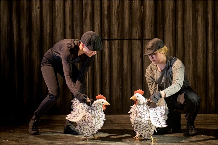 The toadying, obsequious Squeela (puppeteers Ailsa Dalling and Matthew Churcher) And he has a second in command. To begin with, it is Snowball, who is immensely articulate and the only pig who could challenge the power-hungry Napoleon. But ere long he demonises Snowball, accusing him of being a ‘traitor’, of conniving with the humans, and in due course he drives Snowball - who has been delighted that other farms are in revolt ‘We have started something, Comrades’ - away in ignominy. The expulsion of Napoleon’s only potential rival figures prominently in Orwell’s story, and it is one of numerous ways in which this production, although it is partly invention, remains faithful to the original text. The other odious character is Squeela, a toady who acts as Napoleon’s grim and grotty mouthpiece. Squeela is obnoxious (another brilliant voice, but so are they all: goats, horse, cow, hens) is loathsome, sickening, malevolent, repellent. How delighted we are when one of the animals exclaims ‘I’m sick of hearing your stupid voice’. He is a liar – part under instruction, partly off his own bat. ‘Beasts of England’ – their original triumphal song – has now been banned by the leader: ‘it’s a revolutionary song, and the revolution is over’. But the way Squeela’s head is deployed, nastily, nauseatingly is another splendid achievement and his cruel speaking is superb. It’s not possible to identify who was playing which animal – the wonderfully lucid and expressive speakers, the handlers of each beast, innocent (like the brilliantly handled multicoloured goose, with endlessly twisty neck): not just the stimulating, emotive, vulnerable animal cast, who riskily potter around, but the talented, magnificent makers of these superlative, lifelike puppets – every one fantastically authentic- are not individually identified.