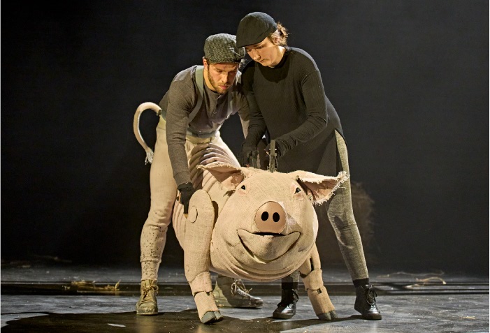 Pictures: Manuel Harlan Animal Farm Coventry Belgrade ***** Where will you find an oversize horse, a patient cow, a pair of attentive goats, a very excitable goose, a furry white dog, flapping ravens and an inquisitive cat – not in a field or farmyard, but, believe it or not, on stage? And not in a sty, but above all, the pigs, who gradually prove themselves not the supporters they claim to be (‘All animals are equal’) but brutal dictators, who prove their venomous nature by – after some 500 days of domination - gradually executing any of the creatures who dare to oppose them. Animal Farm is of course based on George Orwell’s famously imaginative novel published in 1945-6, in which he charts or parodies the savagery of the Stalin years, which in the 1930s saw the pernicious butchering of nearly a million ill-starred Russians, of all classes: leaders and figureheads, intellectuals and yes, savagely ruined, suffering, peasants and farmers, dubbed ‘enemies of the working class’: a pogrom among his own people. It is thus that Orwell, as he said of his hard-hitting book, ‘sought to fuse the political and the artistic into one’. Well here at the Belgrade was a fabulous staging with a difference. A terrific difference. Forget human beings (admittedly there were one or two, and they turn up with rifles near the end). It’s all about animals. The triumph of Robert Icke’s adaptation and production – shared with Birmingham Rep - was the brilliant way the animals were manipulated by almost invisible black-clad operators: of such brilliant, operative skill you really could believe most animals – the majority innocent and filling the stage - were real.