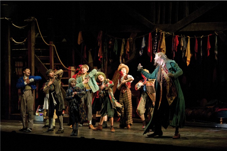 Picking pockets: Neil Morrissey as Fagin taking a lesson in GCSE thieving with his young students in one of the early criminal classes. Oliver! Birmingham Hippodrome **** OLD Fagin and his band of junior thieves