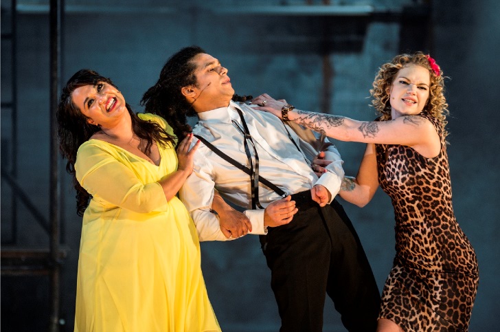 Natasha Lewis (Lucy), Milton Lopes (Macheath) and Cici Howells (Polly) Pictures: Patrick BaldwinThe Threepenny Opera