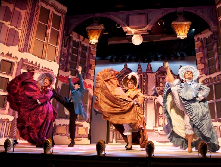 stove even has smoke coming from it's chimney. The sets from John Brooking were simple and effective, a few pushes, turns and folds and whole scenes changed with minimal delay and Brooking's costumes looked the part as well, very Victorian. I am not quite sure why three singing pigs and a