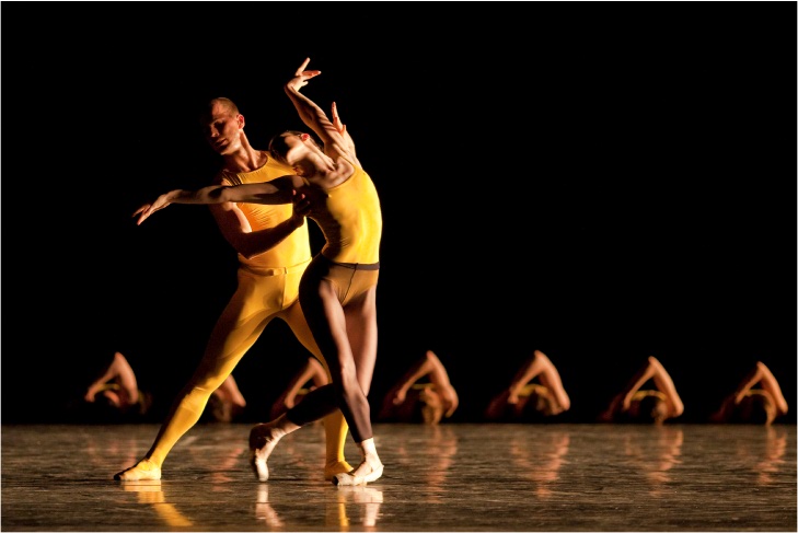 after time and rising to find the 30 strong corps in new formations. This is all the elements of ballet, shape, form, movement and wonderful dancing but with none of the traditional romantic or lyrical story that gives the dances shape. It is dance that is somehow not satisfying, and perhaps that is the point, but it is fascinating and beautifully done by soloists Aki Saito, Wim Vanlessen, Laura Hidlago and Yevgenly Kolesnyk. Legendary choreographer