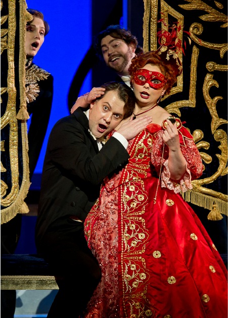 bench by his so called friend. Eisenstein should have smelled a rat, or a bat in this case, but his thoughts are way below head height with the promise of young ladies as sweet, soft and ripe as peaches so off he goes to to see the Prince and his peaches. Gabriel von Eisenstain (Mark Stone) is about to find infidelity is a dangerous game, particularly when the other woman is your wife Rosalinde (Nuccia Focile) in disguise as the Prince (Helen Lepalaan, left) and Dr Falke (David Stout) the architect of the domestic drama to come, look on. No sooner is he out of the door though than