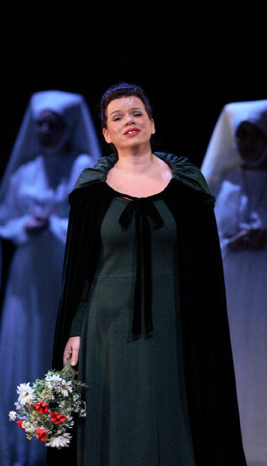 under the imaginative direction of Peter Watson. The performance is entertaining and polished. The collective talent of the whole cast and chorus is remarkable. However, the opera never promised to have a happy conclusion and, thankfully, I didn't warm to the characters enough to care. This is complicated story, with complicated relationships and the surtitles were a welcome aid. The tale tells of Count di Luna, a bereaved brother searching for the murderer of his younger brother, his love for the pitiful and lovelorn Leonora who loves another; Manrico, the lute playing trovatore. the troubadour of the title. Sian Meinir as Inez, Leonora's confidante You do need to take a leap of
