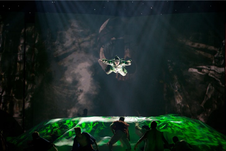 I Believe I Can Fly! Peter Pan soars high into the arena with no wires, flying balanced on a jet of air - a world's first Peter Pan – The Never Ending Story National Indoor Arena, Birmingham ***** If you want to make a big impression, make something big. That’s exactly what Artistic director Geert Allaert did fours year ago with this astonishing multimedia, staged spectacular of the story of J.M Barrie’s Peter Pan. It’s a production that fuses mapped set projection, pyrotechnics, choreography, music and song together with aerial and ground acrobatics and theatre, into a mind blowing visual treat similar to a closing event of the Olympics. The production has toured some 15 major international cities to date and now has landed perfectly at the NIA Birmingham in time for Christmas. Peter, Sandor Stubel, and Wendy played by Lilly Jane Young It’s actually hard to single out any one part of this show as it a seamless flow of technical wizardry with impressive live performances all under the Direction of Luc Petit. His experience with the Cirque de Soleil and other Las Vegas shows is evident as every facet is honed to perfection. The fact that there is such a high degree of computer controlled effects, such as the Mapped project ion which can turn the entire set from a raging sea into a jungle and hundreds of other animated scenes in an instant, that are coordinated perfectly with live performances is a testament to the precision of this event. Musically it features a blend of pop classics with a touch of opera with new arrangements by Matt Dunkley (Moulin Rouge, Batman: The Dark Knight, Pirates of the Caribbean: , Love Actually, The Quiet American etc). Whilst some of these seem a little out of place and not quite fitting in one or two places it does give a level of familiarity to the audience. The leads of Peter and Wendy are played by Dutchman
